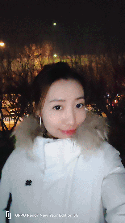 在暗光环境下,即便光源只有身后远处的路灯,但同样能拍摄出明亮白皙的自拍照,后面的背景则依然保留原有的曝光,并不是单纯的整体提高画面的亮度这么简单。而这主要就是手机所搭载的IMX709超感光猫眼镜头带来的全新自拍体验,相比上一代Reno6前置摄像头拥有可以60%的感光能力提升,噪点也降低了35%。