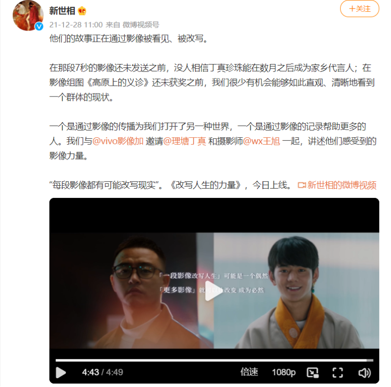 一张偶然拍下的照片,一段真实记录的影像究竟有何种力量?在看过由vivo影像加联合新世相创作的《改写人生的力量》视频后,答案或许就在年度人物丁真与摄影师王旭的对话中。一个因为被“看见”,成为家乡代言人,一个因为“看见”,帮助了很多需要帮助的人群;而这故事的背后恰恰正是影像的力量,让人们相信影像可以改变人生的力量。