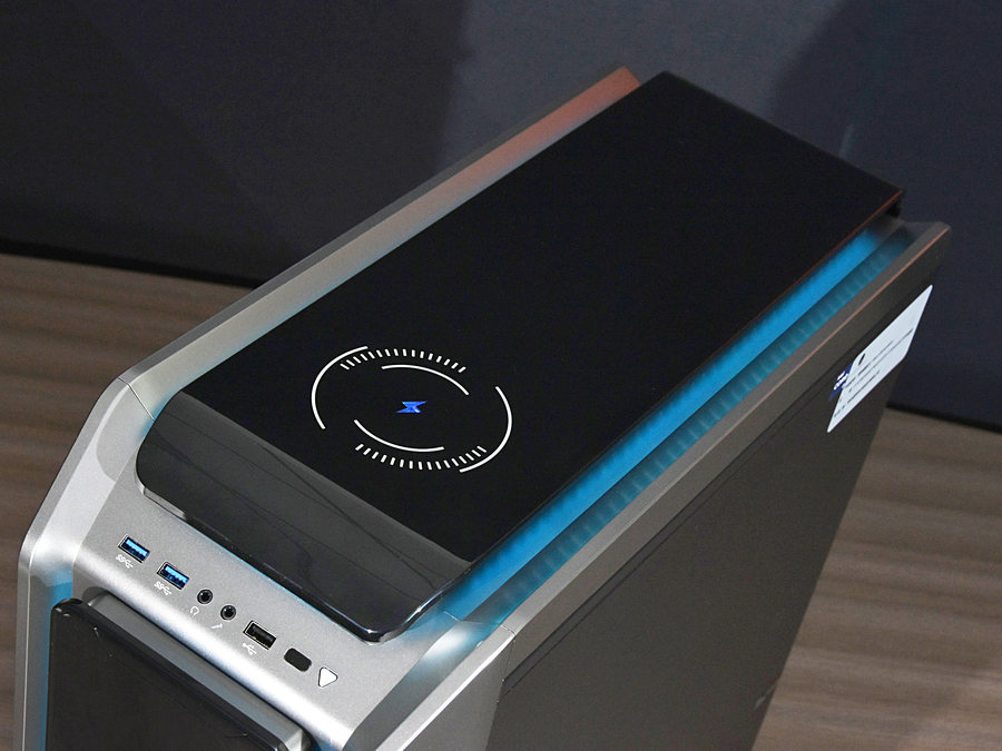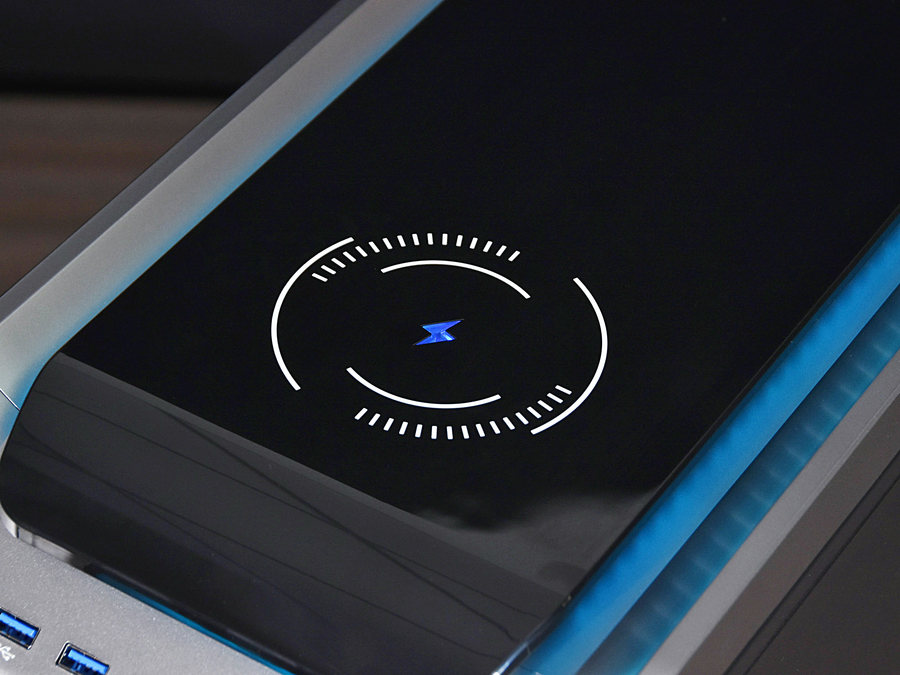 机箱顶部拥有一个非常贴心的设计,那就是加持了QI无线充电功能,可为手机、耳机、鼠标等设备进行充电。