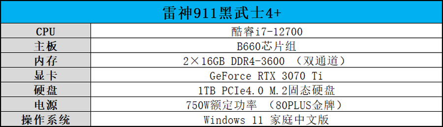 酷睿i7-12700处理器(8+4核)、GeForce RTX 3070 Ti显卡、2×16GB DDR4-3600MHz内存、1TB PCIe4.0固态硬盘,这就是笔者手中这款雷神911黑武士4+的主要配置。怎么样,是不是很强!