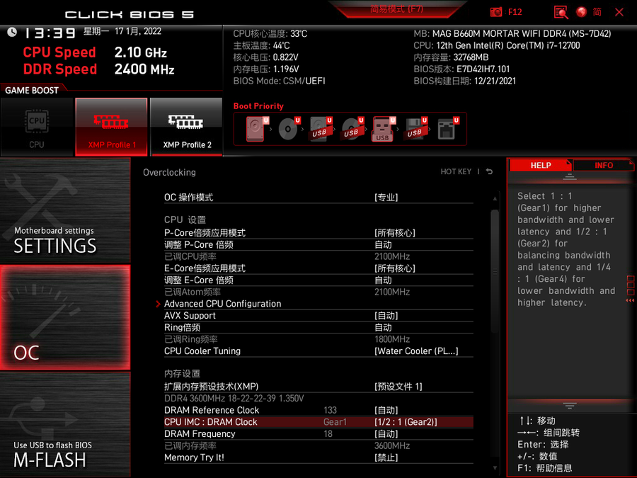 由于英特尔12代台式机处理器加入了内存分频模式,目前主要包括Gear1(1:1)和Gear2(1:2)这两种模式,因此大家在内存超频的时候一定要特别注意下。