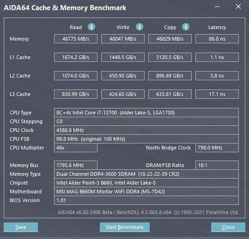 在DDR4-3600MHz频率、Gear2(1:2)内存分频模式下,这款水冷游戏主机的内存读写性能均比较出色。