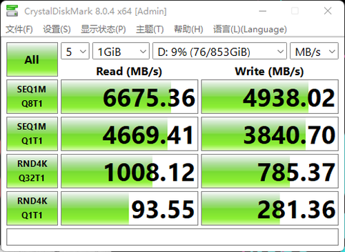 通过CrystalDiskMark这款测试软件的成绩来看,这块SSD的性能非常棒,顺序读取速度超过了6600MB/s,顺序写入速度超过了4900MB/s。