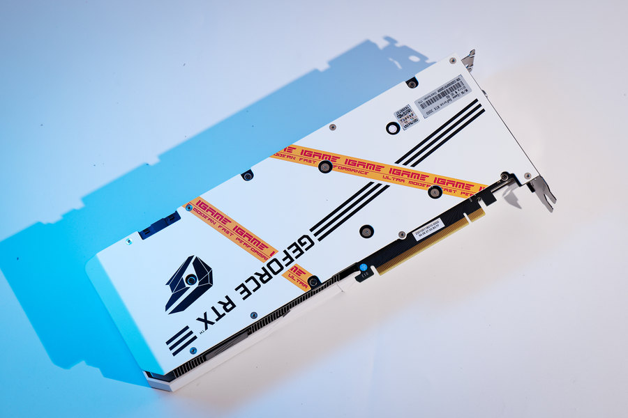 这款显卡搭配了金属背板,背板上面除了LOGO之外,还设计有两条印有iGame字样的装饰带,进一步提高颜值,也让显卡正、反面的风格得以统一。