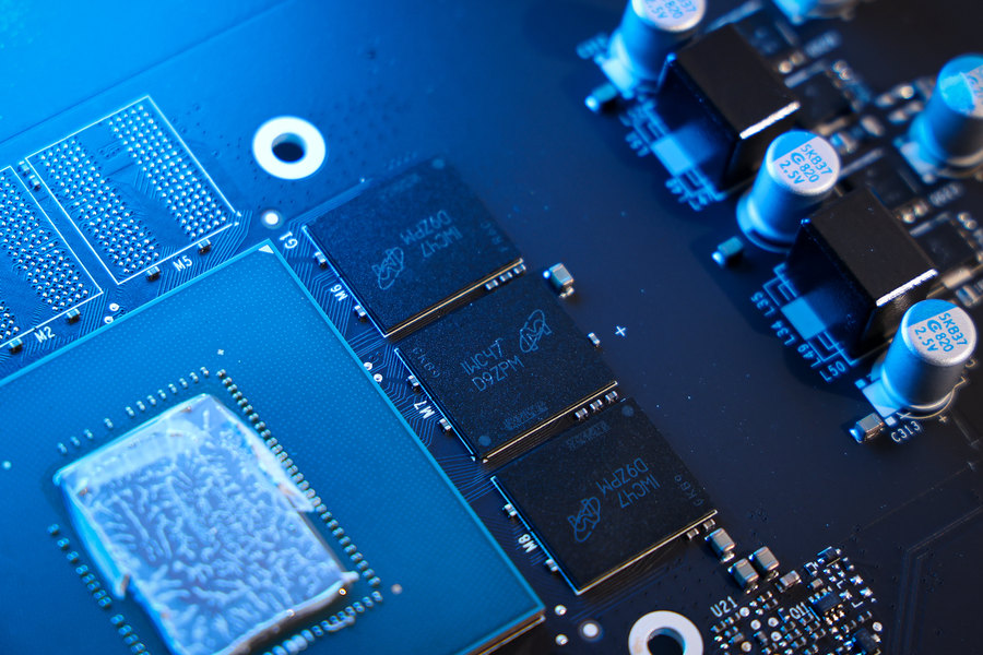 GDDR6显存,供应商来自美光。单颗容量2GB,4颗显存围绕在核心周围,共计8GB。