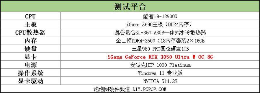 笔者组建了一套性能出色的酷睿 i9-12900K 测试平台,用来测试显卡的性能。为了对比iGame GeForce RTX 3050 Ultra W OC 8G显卡的性能,笔者此次测试还加入了RTX 2060显卡的成绩。该RTX 2060显卡是非公版的。