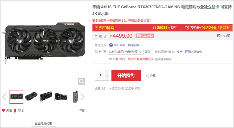 笔者近日在京东商城上发现,京东自营正在预售一款4499元的RTX 3070 Ti显卡,型号为华硕TUF GeForce RTX3070TI-8G-GAMING。这价格,还是华硕TUF系列,买(qiang)到就是赚到!