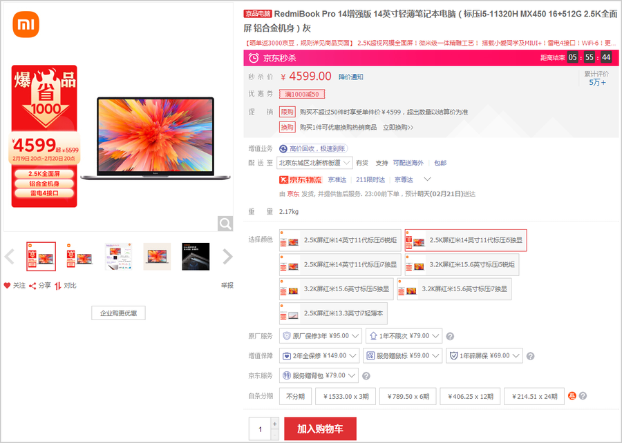 酷睿i5、MX450独显、2.5K屏幕的机型,目前限时秒杀价4599元,叠加使用50元优惠券之后,到手仅4549元。