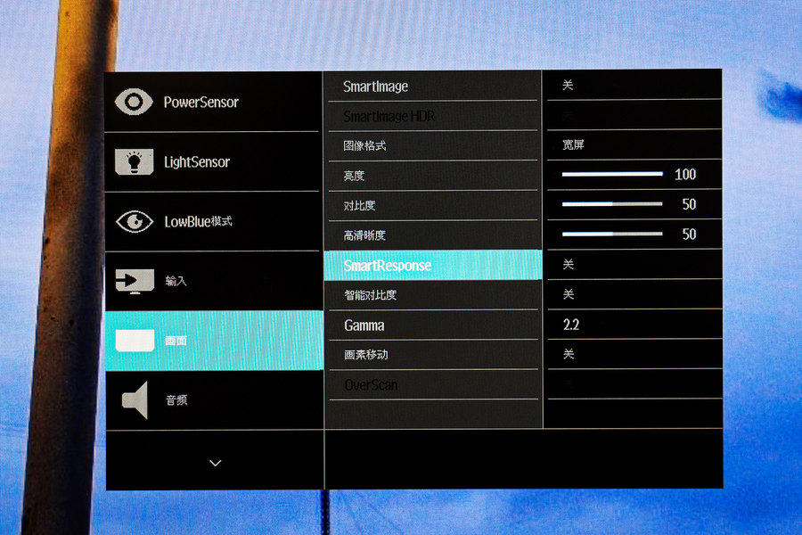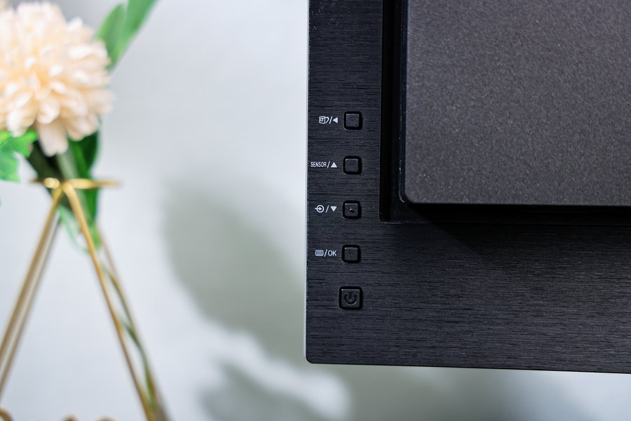 当然, 以上提到的两个功能需要手动开启或关闭,可以直接通过功能按键在显示器屏幕上进行操作,而更简单的方式就是可以直接将智能光感传感器往后折叠隐藏起来。
