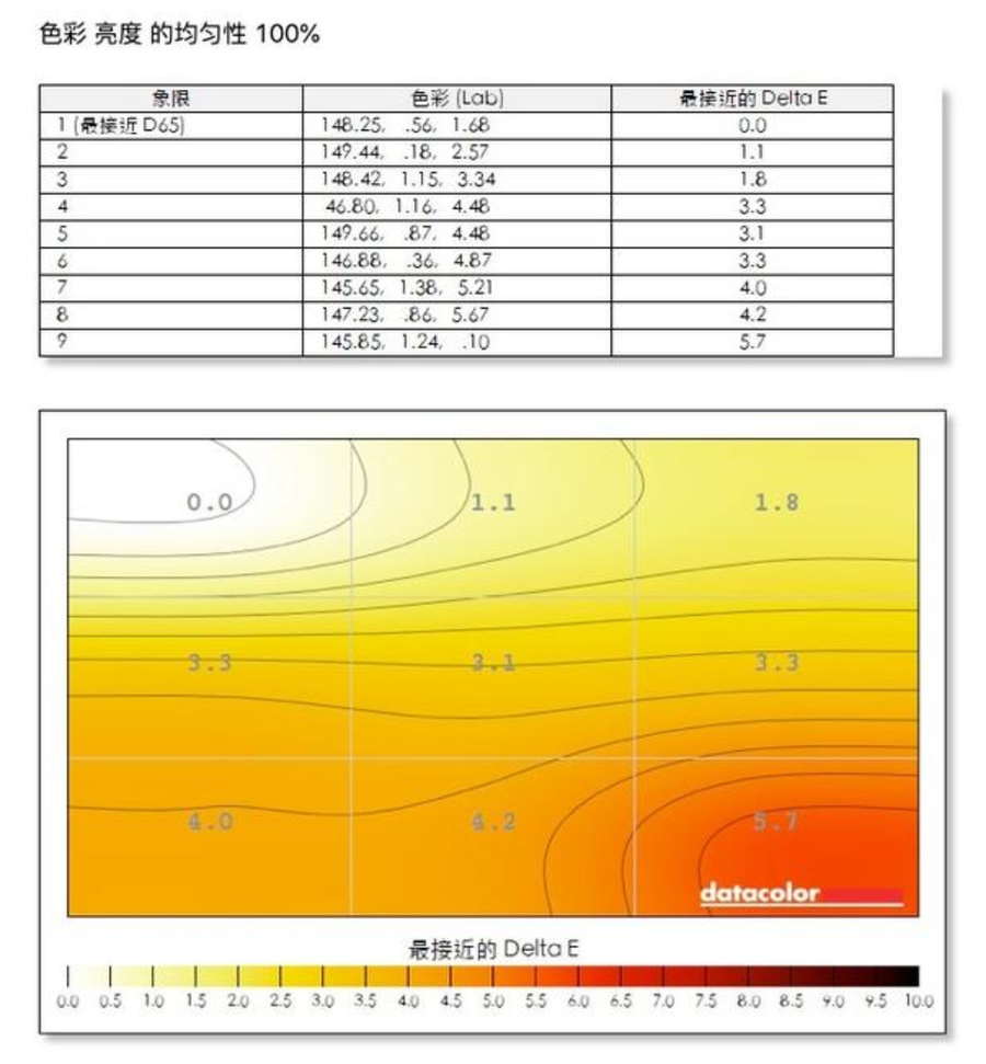 在D65标准中,色温值为6500K表示色彩比较准确,不会出现偏冷或者偏暖。在以上的测试结果中可以看到,飞利浦279P1FR显示器左上角区域(1号测试区域)最接近D65的标准。屏幕整个右下角区域(9号测试区域)偏差最大,但其实相差并没有太多,差值5.7。