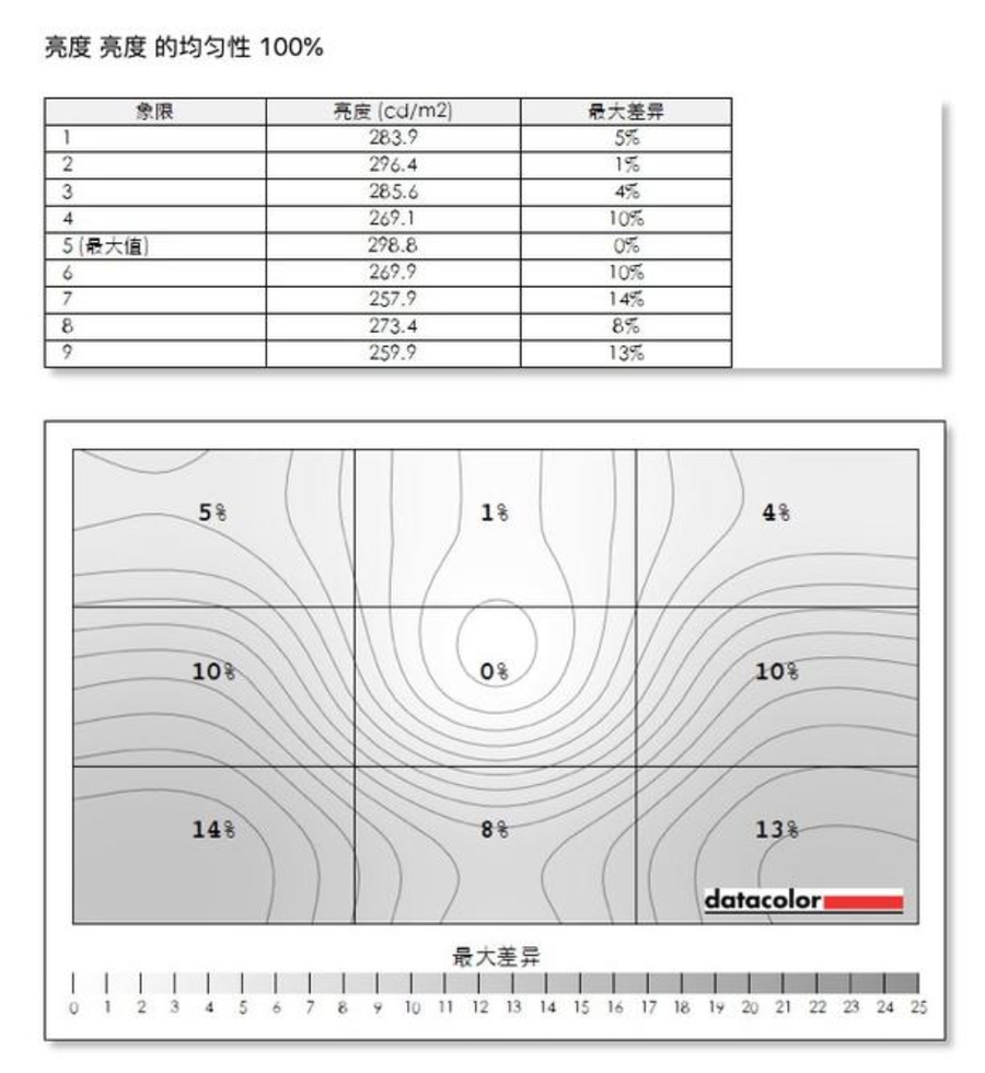 我们还对飞利浦279P1FR在“色温”和“亮度”的均匀性进行了测试。使用红蜘蛛校色仪,屏幕划分为9个大区域,分布测试计算其屏幕在全白、全黑时的亮度以及色度坐标,最终得出结论。测试结束后,测试报告上会显示不同灰度下,该显示器9个区域的亮度和色彩差异值。出现的等效线越密,说明亮度或者色温的均匀性越差。
