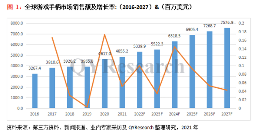 数据显示2020年全球游戏手柄的销售额达到46亿美元,而在2027年预计将会达到75亿美元,提前进场将会在市场中占据更有利的先机。