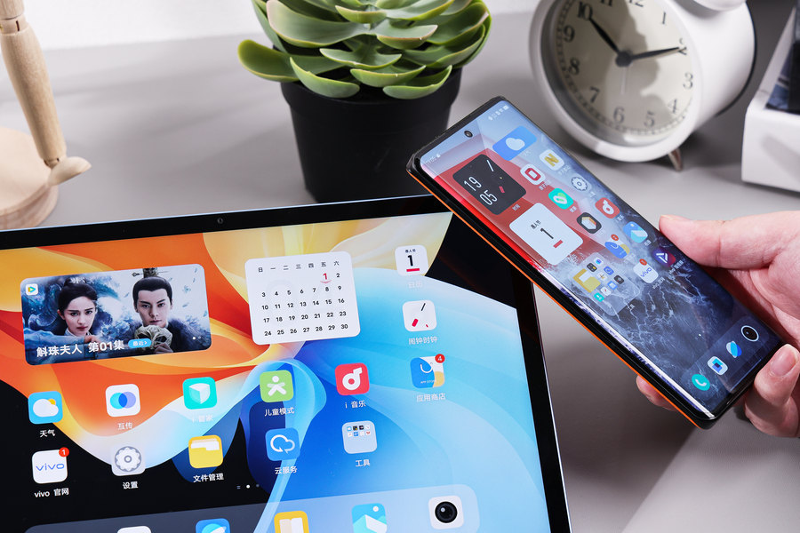 vivo Pad屏幕右上方内置了NFC模块,在完成配对连接后只需同手机碰⼀下平板右上角,就能将手机界面、正在进行的任务或选中图片文件传屏至平板。