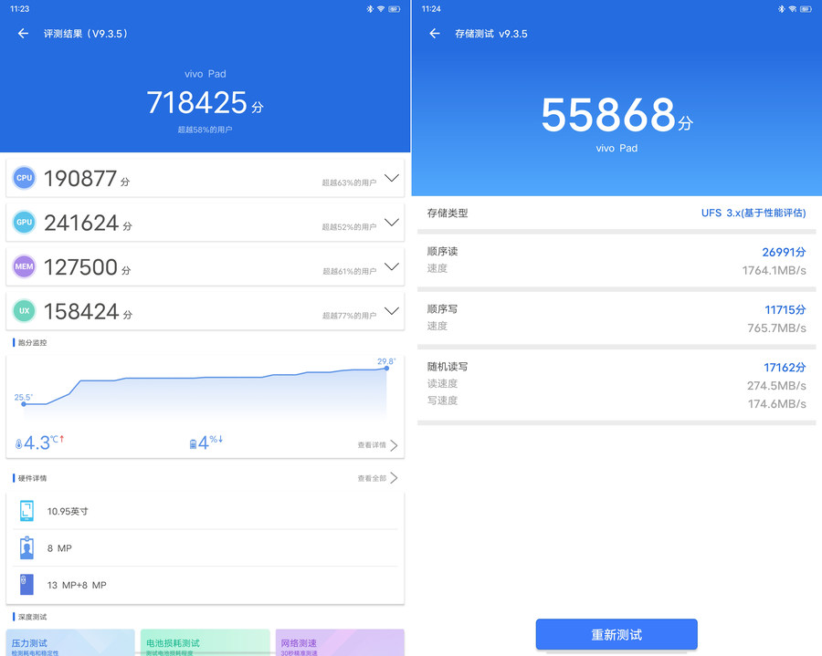 在安兔兔的跑分测试中,vivo Pad获得超过71万+的好成绩,在目前新一代的安卓平板中绝对算得上第一梯队。存储读取测试中,vivo Pad的顺序读取速度达到 1764.1MB / s,顺序写入速度达到765.7MB / s,表现也相当不错。