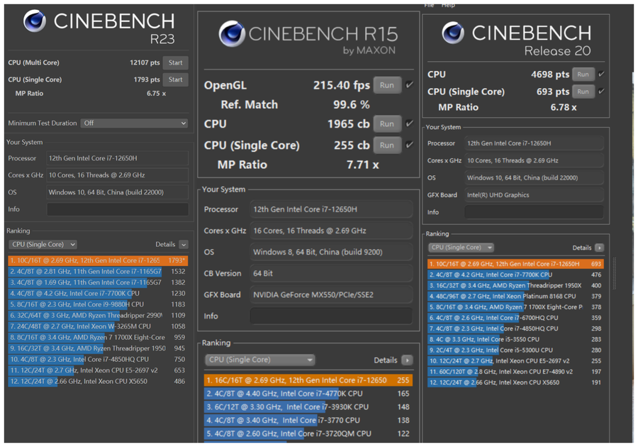 使用CINEBENCH R15、R20以及R23对RedmiBook Pro 14 2022进行测试,成绩也同样出色,这样的性能表现在日常办公时游刃有余,即使是一些图像处理、渲染等工作,也没有问题。