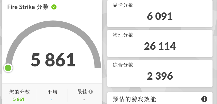 Fire Strike 是对GPU性能的综合性测试,使用DirectX 11引擎并且是专门用来测试DirectX 11兼容硬件的,RedmiBook Pro 14 2022的成绩为5861属于一个不错的分数。其中显卡得分6091,物理得分26114,综合得分2396。