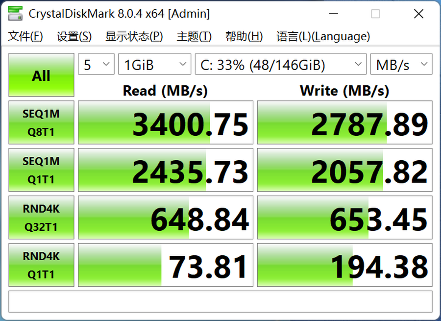 硬盘方面,RedmiBook Pro 14 2022内置512GB PCIe 4.0 SSD,顺序读取速度也达到3400.75MB/s,写入速度2787.89MB/s,在速度方面与上一代相比有了进一步的提升。