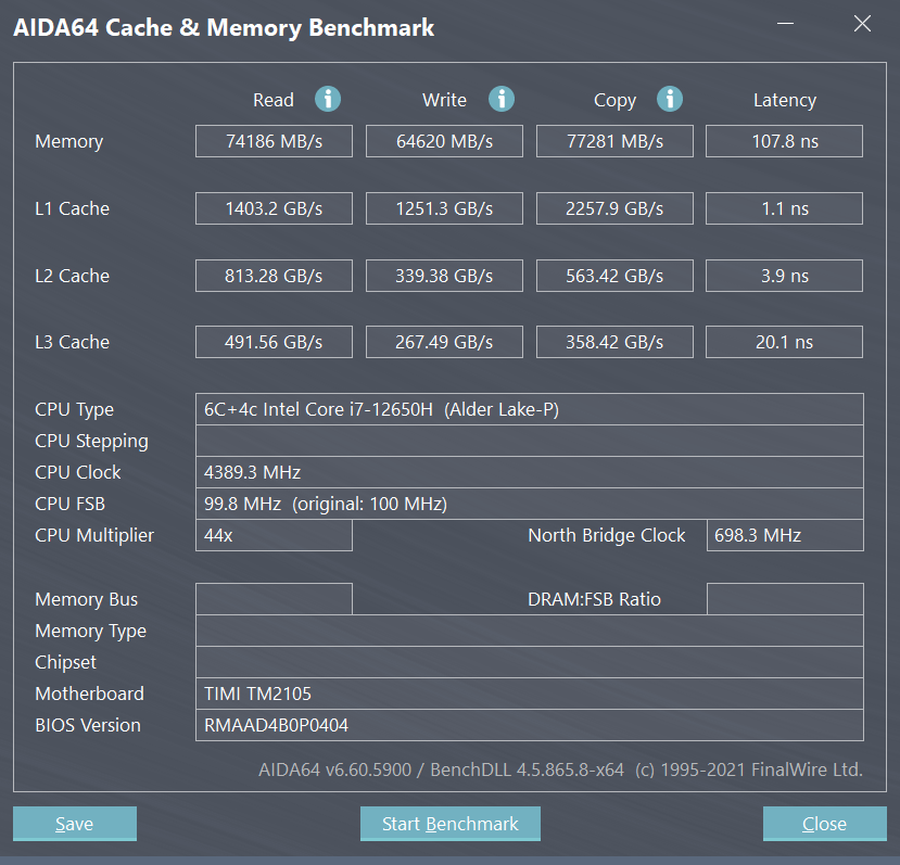 RedmiBook Pro 14 2022配备16GB LPDDR5 5200MHz 双通道内存,经过AIDA64测试的读取速度为74186MB/s,写入速度为64620MB/s,复制速度为77281MB/s,时延为107.8ns,足以应对日常所需。