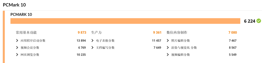 PCMark 10可以测试整机的综合性能,尤其是在模拟现代办公方面,代表在日常办公环境下笔记本的性能表现。经过测试,RedmiBook Pro 14 2022的综合成绩为6224,这也是目前旗舰笔记本的水平。