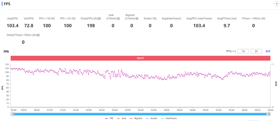 经过Perfdog测试,三星Galaxy S22 Ultra运行《王者荣耀》的平均帧率为104FPS。从帧率曲线来看,在游戏过程中帧率最低也在85FPS以上,因此游戏时整体的流畅度表现还是较为出色的。