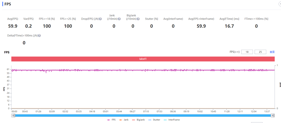 经过Perfdog测试,三星Galaxy S22 Ultra的平均帧率为59.9FPS,游戏过程中帧率稳定,没有明显的波动,非常的流畅。
