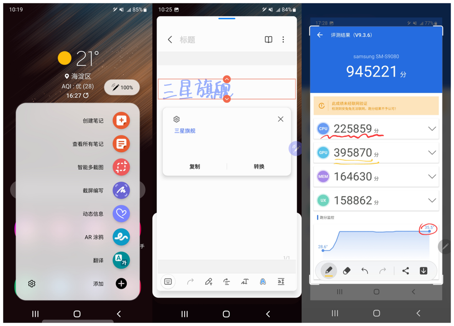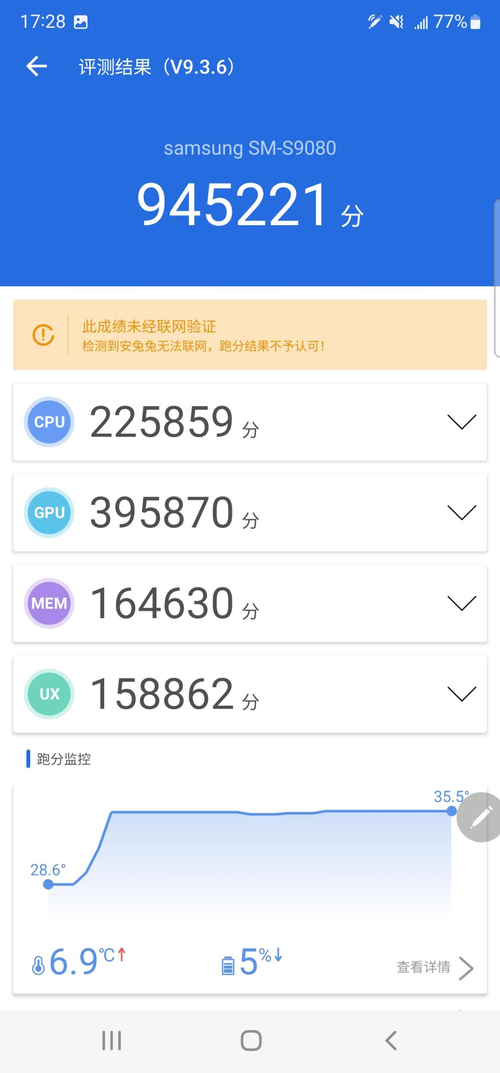 经过实测,三星Galaxy S22 Ultra的跑分成绩为945221分,在测试中跑分监控显示机身温度最高仅为35.5℃,跑分期间温度上升大约在7℃,对于温度的控制比较出色。
