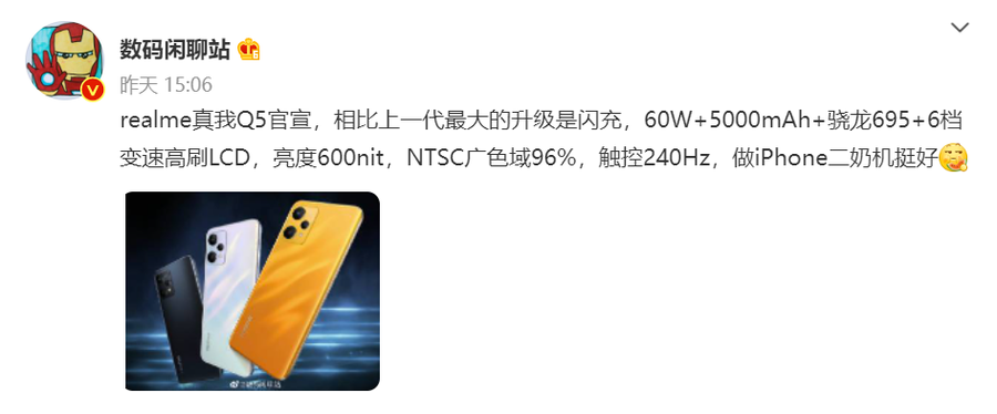 据@数码闲聊站爆料,真我Q5配置为60W+5000mAh+骁龙695+6档变速高刷LCD,亮度600nit,NTSC广色域96%,触控240Hz。