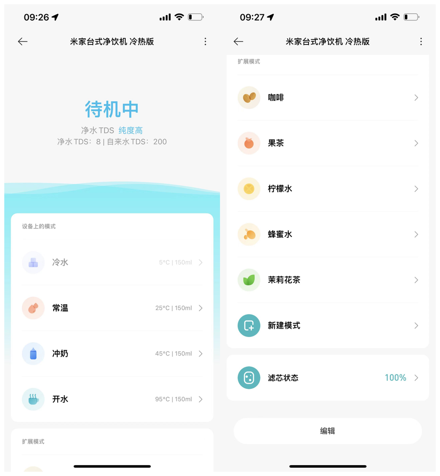 除了机器自带的"冷水"、"开水"、"冲奶"、"常温"模式外,只要连接米家APP,用户还可以自行设定专属模式,可以根据用户需求自行调整。