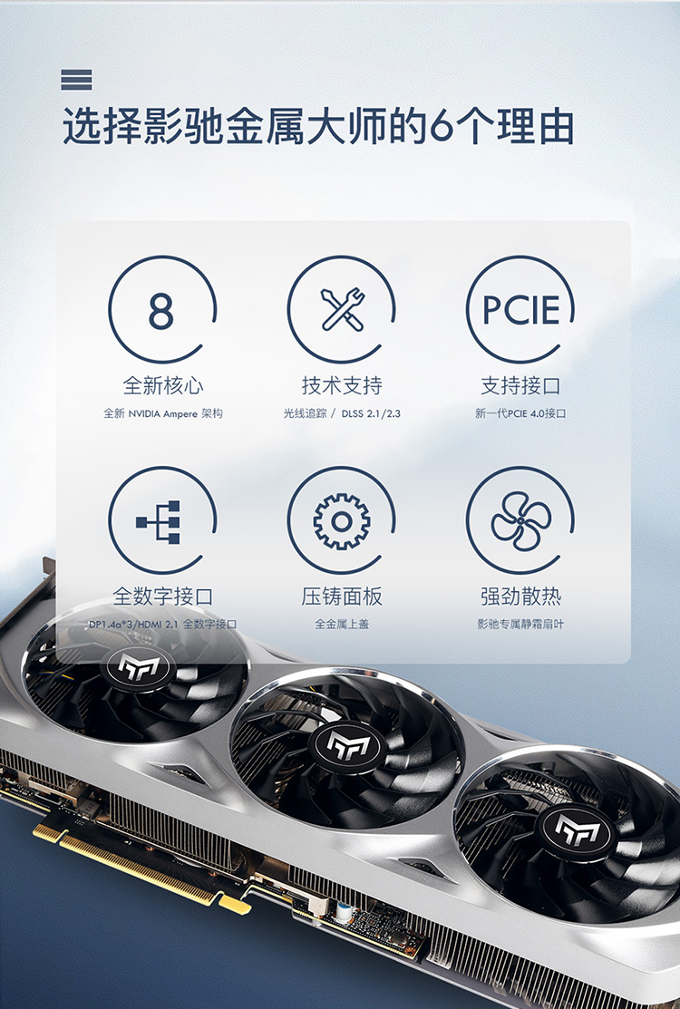 影驰RTX 3080 金属大师MAX OC[FG] 12GB显卡使用了NVIDIA AMPERE架构,具备开启RTX光线追踪与DLSS技术的实力,有多款3A大作游戏都支持开启,几乎是游戏党必备。而12GB大小的GDDR6X显存更是不容小觑,能够进行高分辨率下的游玩,不容易爆显存,游戏特效拉满都没问题,如果你未来想流畅运行《黑神话:悟空》等游戏大作,那么现在入手影驰这款高性能显卡,就是最佳时机~