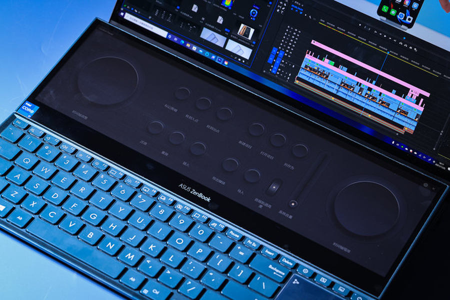 华硕灵耀X双屏Pro已经适配了一部分创作办公软件,比如很常见的PR软件,打开后会在副屏显示适配过的工具栏,可以在上面快速调节时间轴等,更直接的操作可以提升交互的效率等。