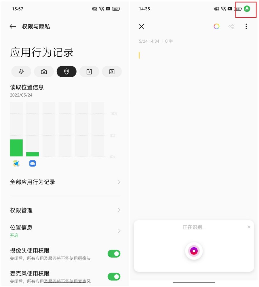 此外,手机的摄像头、麦克风、位置权限这些敏感的权限被调用时,会在右上角有提醒,能够有效避免用户不知情的情况。