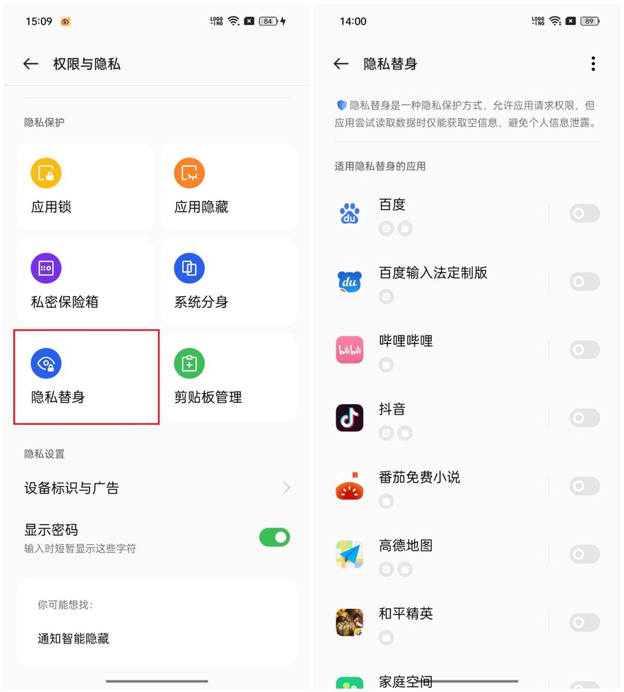 OPPO Reno8 Pro+支持隐私替身功能,对特定应用开启后,当其尝试读取数据,只能获取到空信息,能够有效避免个人信息泄漏。