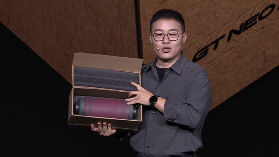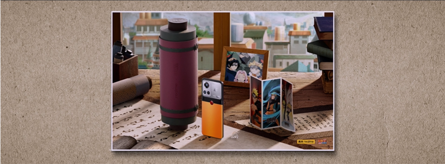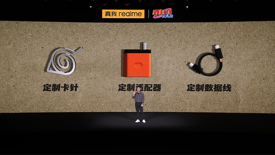 realme中国区总裁徐起现场给大家带来了开箱,可以看到,该机外包装采用了火影当中的“忍法卷轴”设计,环保皮革材质制造,便于收藏。