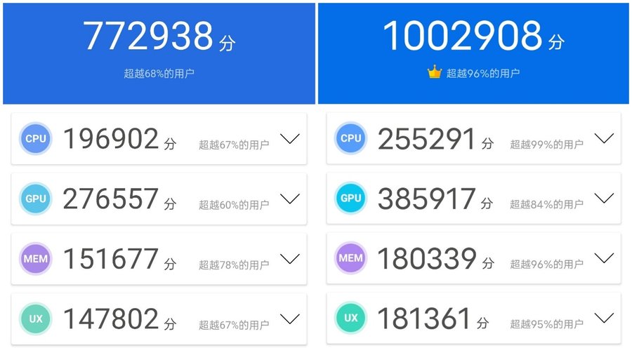 跑分方面,搭载天玑8000-MAX机型安兔兔综合跑分达到77万+,属于中高端水准。而搭载天玑9000的机型安兔兔综合跑分达到100万+。