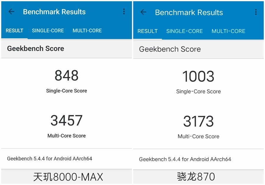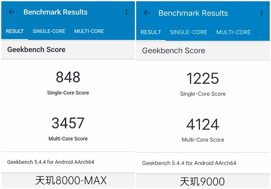 天玑8000-MAX机型GeekBench 5单核跑分848,多核跑分3457。天玑9000机型GeekBench 5单核跑分1225,多核跑分4124。无论是单核或者多核理论性能,天玑9000都与天玑8000-MAX拉开不小距离。