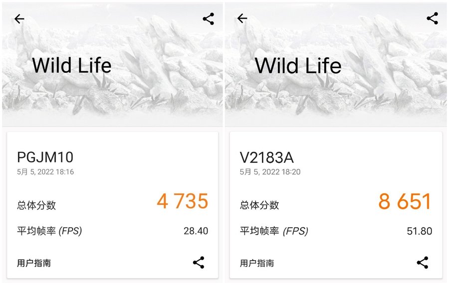 3DMark Wild Life基准测试可以体现芯片的GPU性能,天玑8000-MAX在此项测试中,总分为4735,平均帧率为28.4。天玑9000的总分为8651,平均帧率达到51.8。天玑9000的GPU理论性能上有较大领先优势,有助于提升高负载游戏场景的帧数表现。