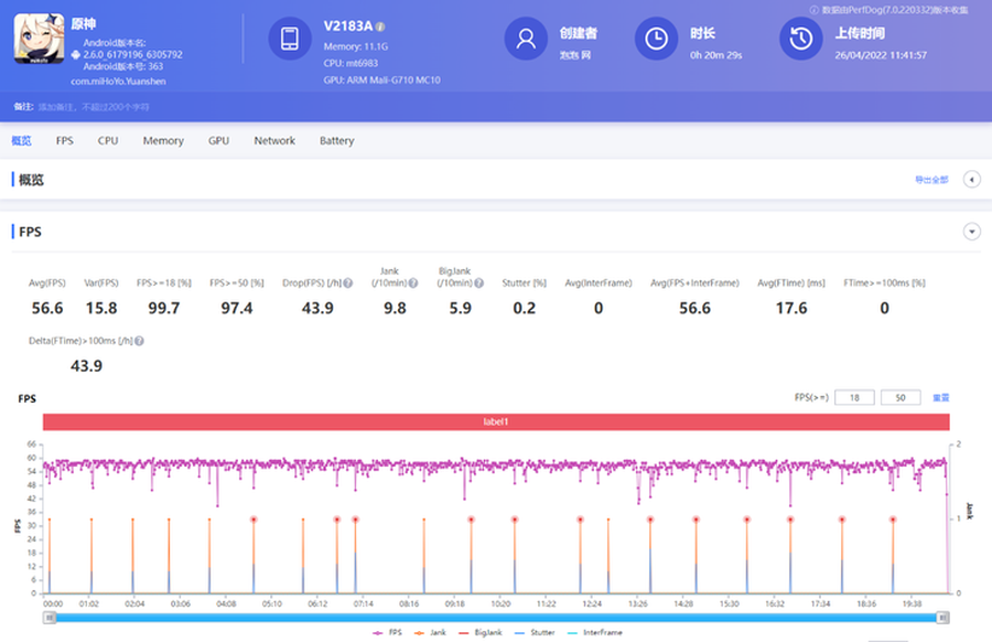 在负载更高的游戏中,天玑8000-MAX机型在极高画质+60帧设置下,玩《原神》20分钟,PerfDog软件记录到的平均帧数为49.3帧。前5分钟平均帧可达57帧左右,性能释放激进。后面因为温度上升,出现了阶段性锁帧,接近20分钟游戏后,帧率维持在40帧左右。