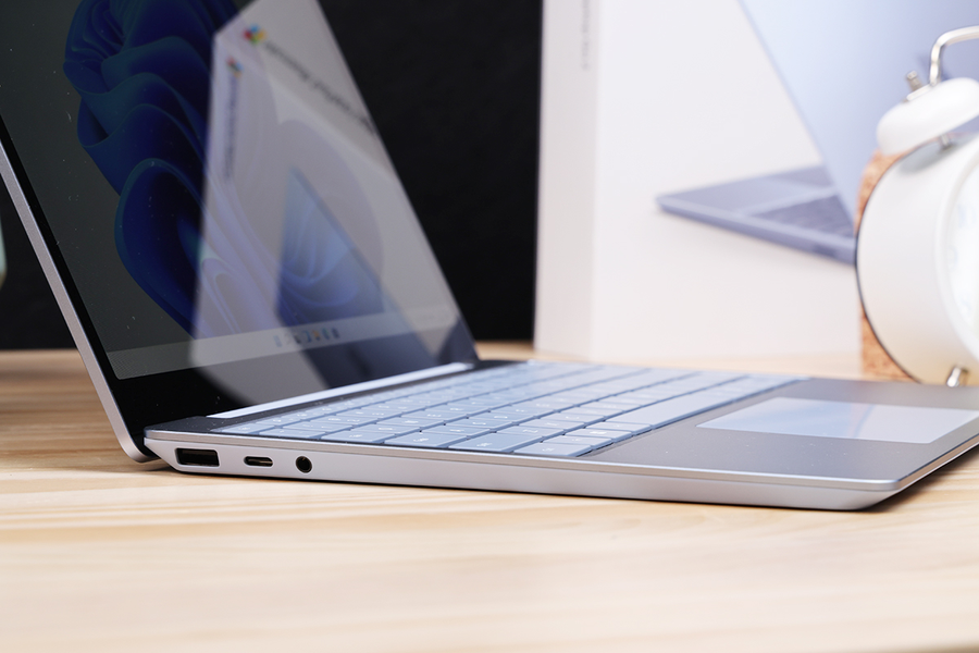 接口方面,Surface Laptop Go 2机身左侧的为USB-A接口、USB-C接口以及3.5mm耳机插孔。