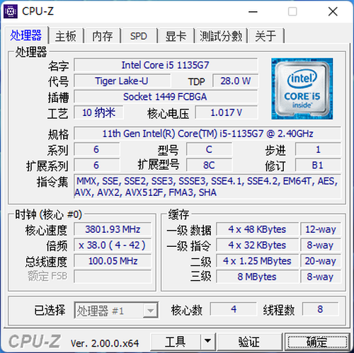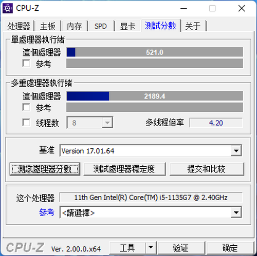 第11代英特尔酷睿i5-1135G7四核处理器采用10nm SuperFin制程,拥有4核8线程,拥有8MB三级缓存,默频2.4GHz,最大睿频可达4.2GHz。经过CPU-Z基准测试,单核处理器得分521,多核处理器得分2189.4。