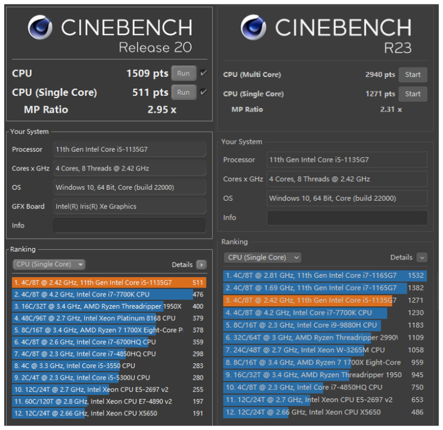 在CineBench R20的测试中,单核511 pts,多核1509 pts,CineBench R23单核1271 pts,多核2940pxs。