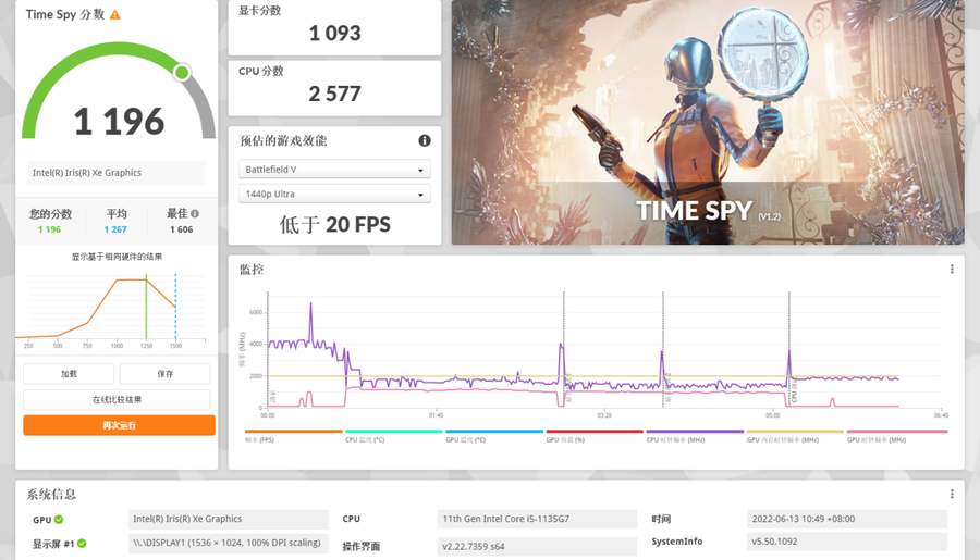 3DMark Time Spy是一个DX12基准测试,可分别测试GPU和CPU对DX12的支持,主要适用于游戏本,结果显示综合分数1196,显卡分数1093,CPU分数2577。