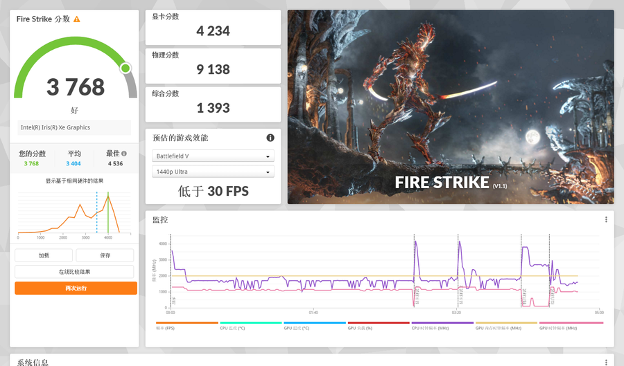 Fire Strike是对GPU性能的综合性测试,使用DirectX 11引擎并且是专门用来测试DirectX 11兼容硬件的。Surface Laptop Go 2的Fire Strike得分为3768分,显卡得分4234,物理得分9138,综合得分1393。