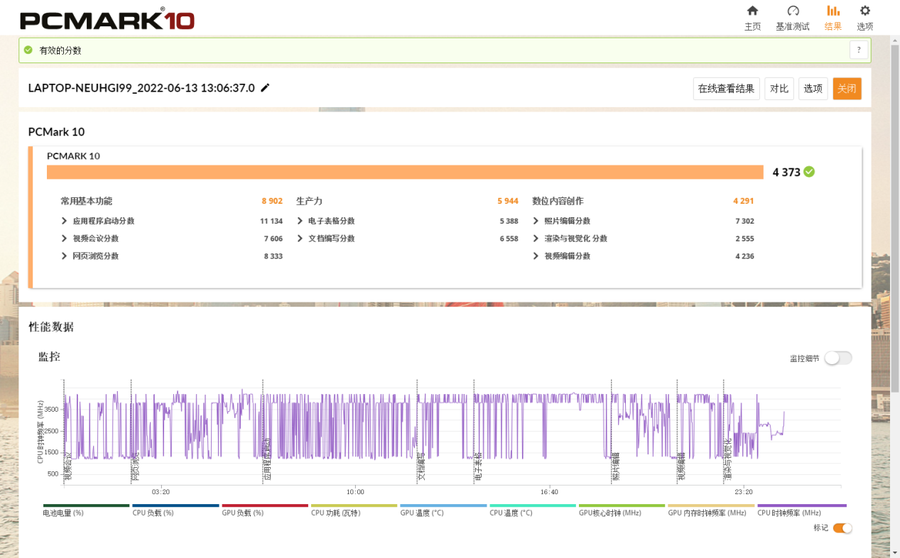 PCMark 10可以测试整机的综合性能,尤其是在模拟现代办公方面,代表在日常办公环境下笔记本的性能表现。经过测试,Surface Laptop Go 2的综合成绩为4373,对于一款轻薄便携本来说,这样的成绩还是很不错的。