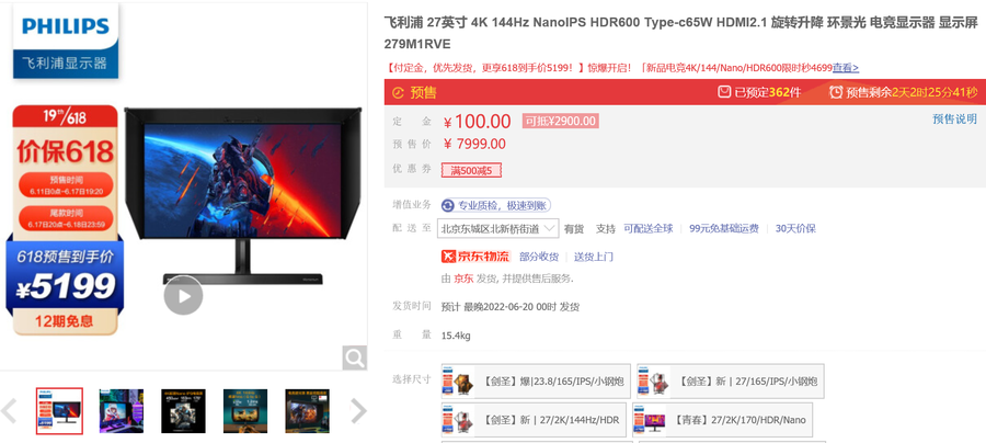 飞利浦279M1RVE电竞显示器 京东618促销价:5199元 >>购买链接