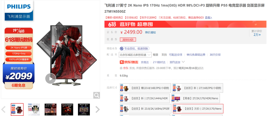 飞利浦27M1N5500Z电竞显示器 京东618促销价:2099元 >> 购买链接
