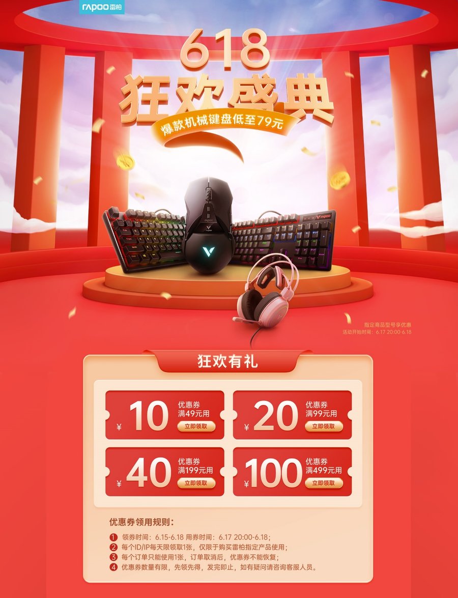 在雷柏京东促销页面,雷柏准备了多种面额优惠券可领取,包括满49元减10元、满99元减20元、满199元减40元、满499元减100元,购买雷柏指定产品可使用。现在前往雷柏京东活动页面已经可以领取优惠券,用券时间为6月17日20点到6月18日。活动期间购买雷柏产品的朋友可以先领券,看看是否能够享受满减优惠。