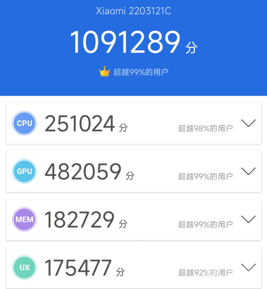 经过实测,小米12S Ultra的跑分数据为1091289分,出色的性能表现也为手机带来了更好的游戏体验。