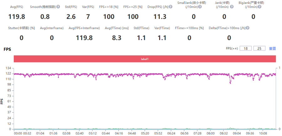 《王者荣耀》在小米12S Ultra上可以设置为极高帧率,我们使用PerfDog来对手机的游戏帧率进行测试,经过一局游戏,小米12S Ultra运行《王者荣耀》的平均帧率为119.8FPS,在整个游戏过程中画面流畅。