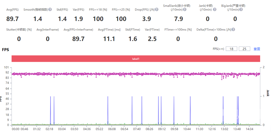 《和平精英》在流畅画质下可以开启90帧模式,经过一局游戏的测试,PerfDog显示平均帧率为89.7FPS。帧率曲线显示,游戏过程流畅度还是非常不错的,90帧的帧率下依旧可以获得持续稳定的游戏体验。