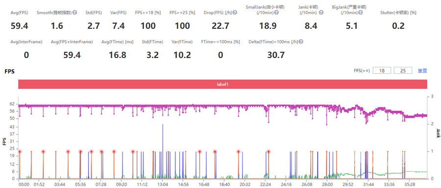 《原神》选择最高画质,60帧模式,经过30分钟的测试,游戏的平均帧率达到了59.4FPS,通过PerfDog的帧率记录显示,整个游戏过程帧率的波动在51FPS-60FPS之间,在游戏过程中绝大部分时间帧率都是比较稳的,后面会有一定的波动,但对于画面流畅度的影响并不大。